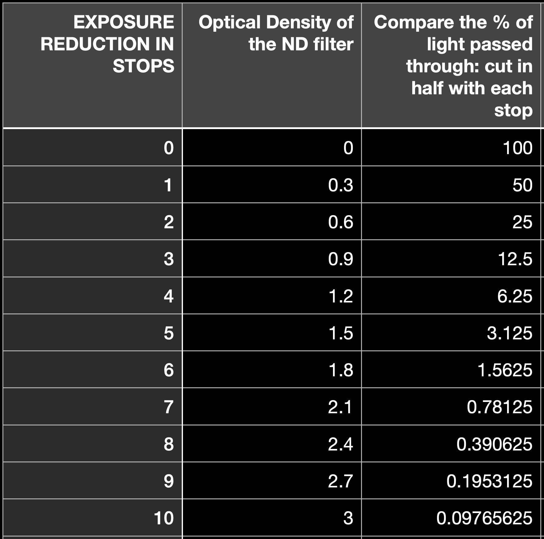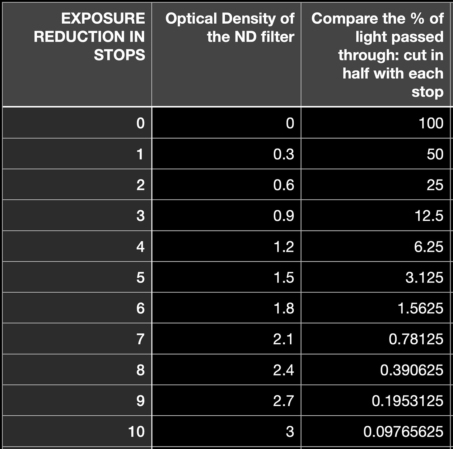 ND filters come marked in Stops and/or Optical Density numbers — all you need to know is that higher numbers mean less light. The less light coming in, the longer an exposure you can have.