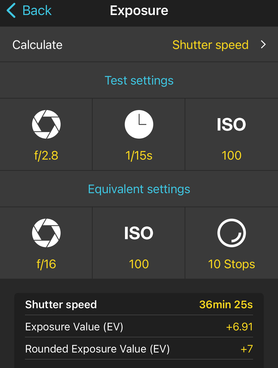 If I want to do ten-stop reduction in exposure, first I need to do a test exposure with no filter to set up my framing and check my base exposure. Let’s say I do an in-camera meter and arrive at ƒ2.8, 1/15th second, ISO 100 as my base. Now I can either do the math in my head, or use an exposure equivalency calculator, like the one in PhotoPills2 .